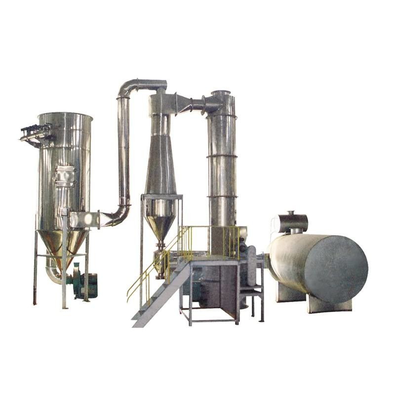물질은 직접적으로 스크류 피더를 통하여 건조탑에 들어가고 고속 기류의 영향과 구동 하에, 그것은 신속히 분산되고 고속으로 기류로 회전합니다. 상대적으로 크고 습기 있는 입자를 위해, 고속 기류는 고속으로 깨지고 회전하기 위해 충분하지 않고 따라서 그것이 점진적으로 중력의 작용에서 하락합니다. 그리고 나서 고속 기류로 그것이 메인 머신의 바닥으로 떨어질 때, 맨 아래 위치된 마쇄기는 깨지고 초미세화하도록 강요받습니다. 회전 프로세스는 건조 프로세스를 완료하기 위해 반복됩니다.