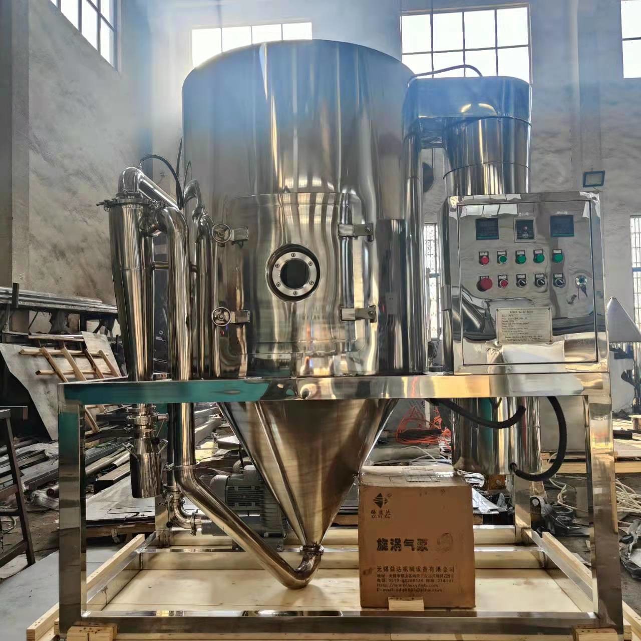 공기가 필터링되고 뜨거워진 후, 그것은 공기 배분기 의 위에 드라이어에 들어갑니다.허풍은 한결같게 나선형 형태에서 드라이링 방에 들어갑니다.탑 꼭대기에 고속도 원심력 분무기를 통과할 때, 원료액은 회전하고 극단적으로 미세 분무 액체 비즈 안으로 분사될 것입니다.허풍과 연락하는 매우 짧은 시간을 통하여, 물질은 말립니다.최종 생산품은 건조탑의 바닥으로부터 그리고 사이클론으로부터 끊임없이 배출합니다.배출 가스는 송풍기에서 해고될 것입니다.