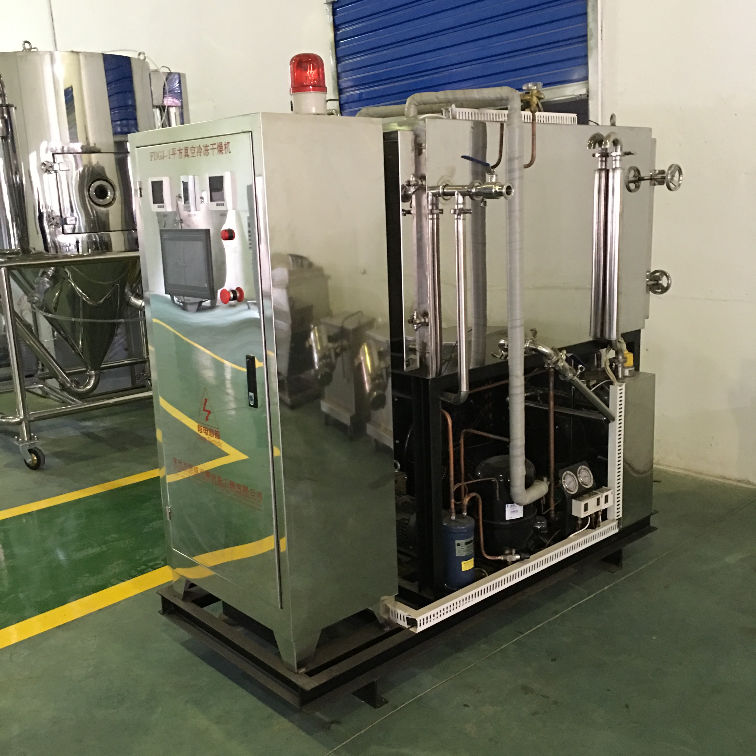 동결 건조기는 냉장 시스템, 진공 시스템, 가열 시스템과 전기적 계측기제어 시스템으로 구성됩니다. 주성분은 오븐, 콘덴서, 냉각 장치, 진공 펌프, 난방/냉방 장치입니다. 그것의 작업 원칙은 물질이 특정 온도 아래에 동결되게 하는 것이고 그리고 나서 공백의 조건하에서 물 (얼음)의 고체 상태가 직접적으로 수증기 안으로 승화되고 밖에 마른 품목을 얻도록 방전됩니다.